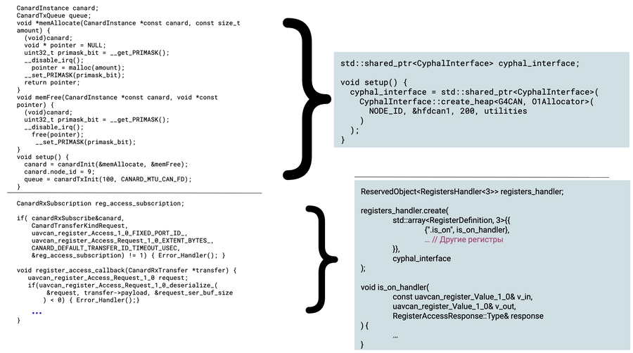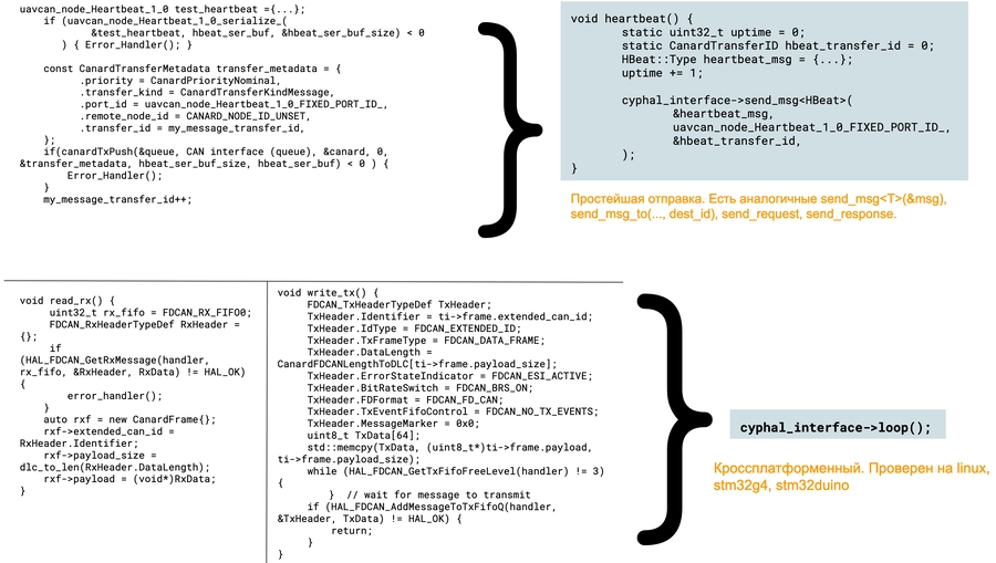 По сравнению с libcanard, работа с отправкой/приемом сообщений гораздо проще. Есть единственное неудобство: из-за того что libcxxcanard работает поверх сишного libcanard, для любого используемого типа сообщений нужно (единожды) использовать макрос TYPE_ALIAS - TYPE_ALIAS(УдобноеНовоеНазваниеТипа, сгенерированный_cyhal_тип_сообщения).