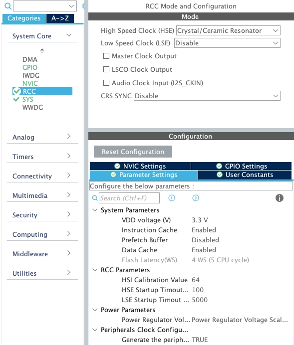 Кроме того, мы будем использовать внешнее тактирование во всех проектах, каждый раз этот этап повторять в инструкциях не будем, но надо помнить, что это обязательно настроить. System Core -> RCC -> High Speed Clock -> Crystal/Ceramic Resonator.