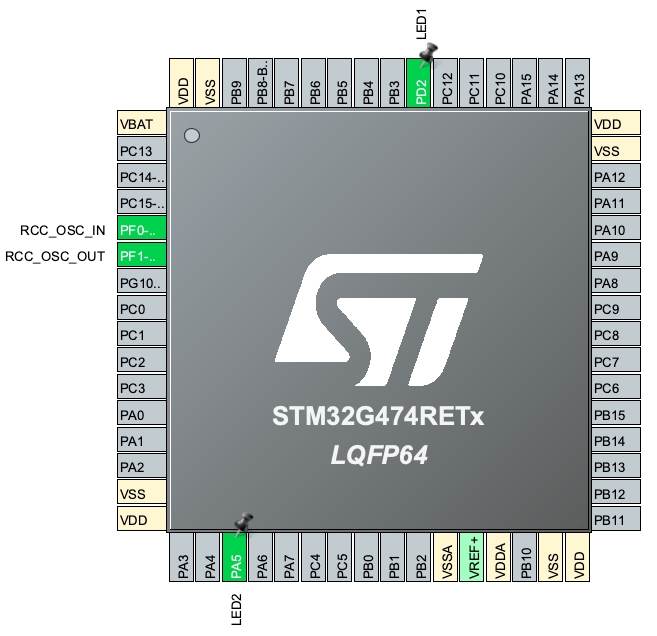 Мы будем использовать два диода, LED1 и LED2. Соответственно, ножки PD2 и PA5 выставляем в GPIO Output.