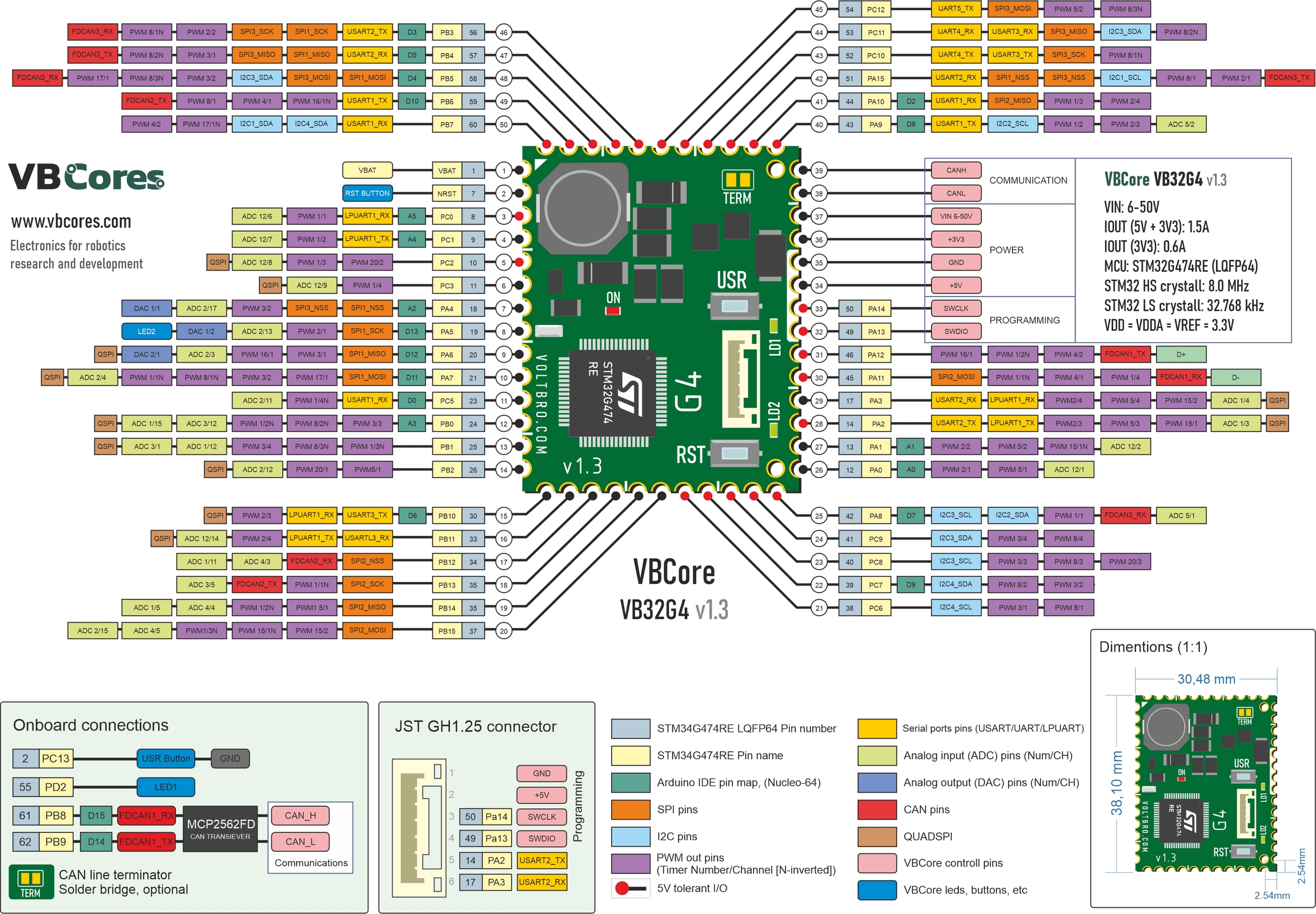 The main VBCore module based on the STM32G474RE microcontroller. The device embeds essentials for building various electronics hardware: