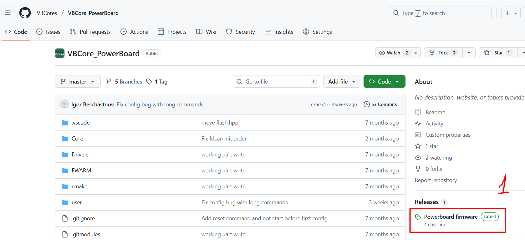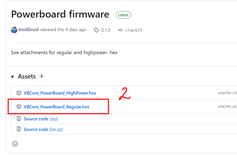 Перейдите во вкладку **Releases** и скачайте файл прошивки **VBCore\_PowerBoard\_Regular.hex** на свой компьютер.