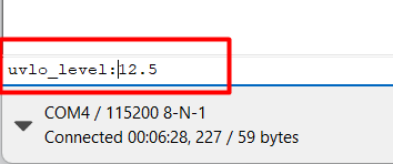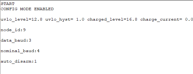 На скриншоте выше видно, что заданы параметры `uvlo_level`, `uvlo_hyst`, `charged_level`, `charge_current`, `node_id` и другие. Чтобы изменить какой-либо параметр, введите его имя и новое значение через двоеточие: