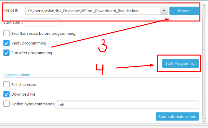 * **Откройте** вкладку **Erasing & Programming** и выберите скачанный файл *VBCore\_PowerBoard\_Regular.hex,* **загрузите** его на устройство.